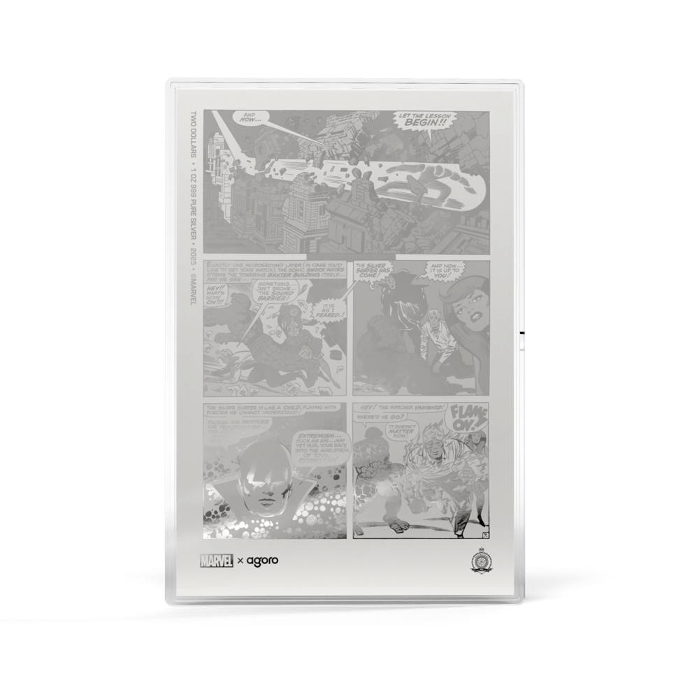 The power cosmic takes flight. This 1oz pure silver foil immortalizes Marvel Comics Fantastic Four #72, the issue that captured the Silver Surfer’s mythic confrontation with Marvel’s First Family.