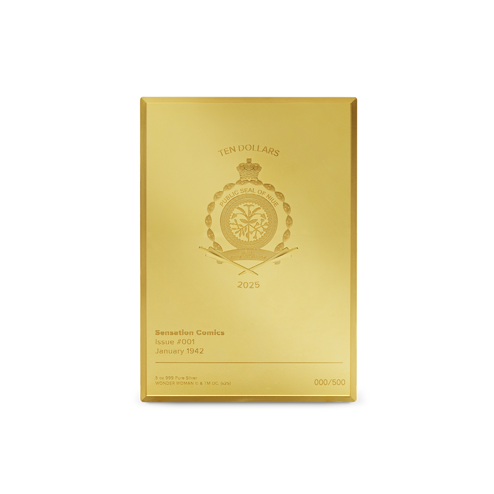 - Fully engraved with intricate frosting and mirror-finish, the design depicts the 1942 cover of Sensation Comics #1.