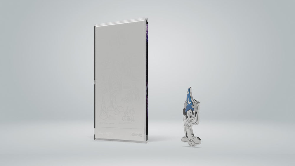 - Includes 1oz 999 pure silver Sorcerer’s Apprentice Mickey and 5g 999 pure silver postcard foil
