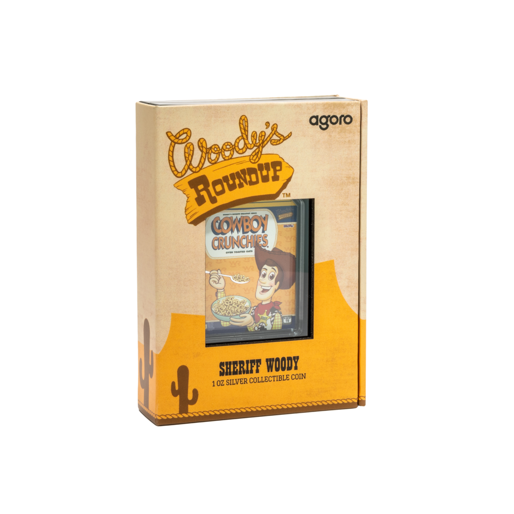 1oz 999 pure silver, the first release honors Disney’s Sheriff Woody, resembling a Cowboy Crunchies box.