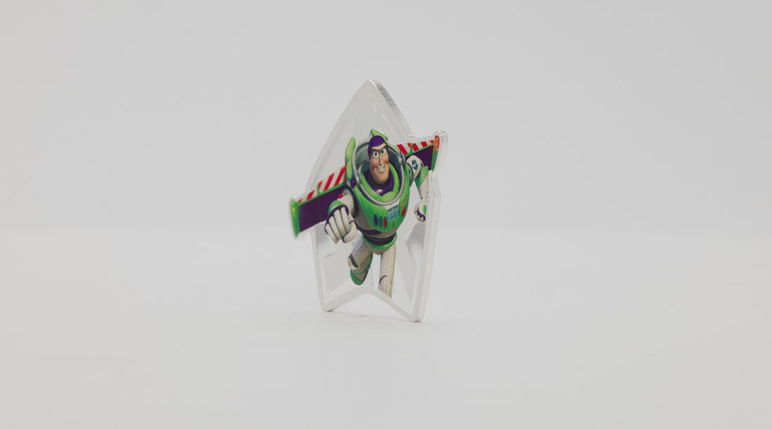 Celebrate 30 years of Disney and Pixar’s Toy Story (1995) with this officially licensed 1oz pure silver collectible shaped in honor of Pixar’s Buzz Lightyear. Struck in 999 pure silver, Buzz appears in his original 1995 animation style, ready to blast off on a space-faring adventure.