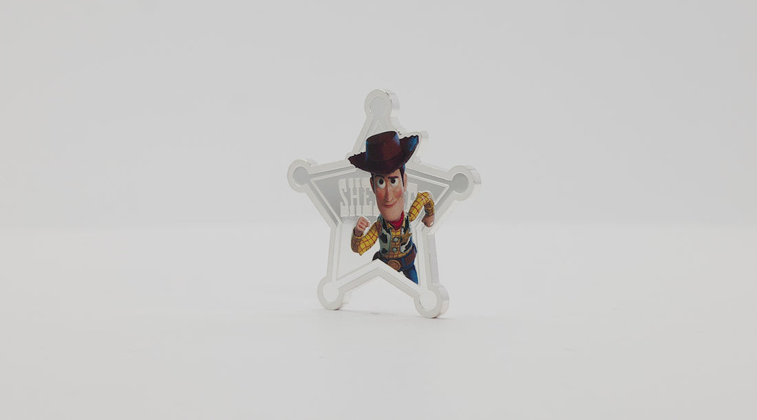 With a frosted silver backing and sheriff-star silhouette, this piece brings Disney and Pixar heritage into precious metal form.