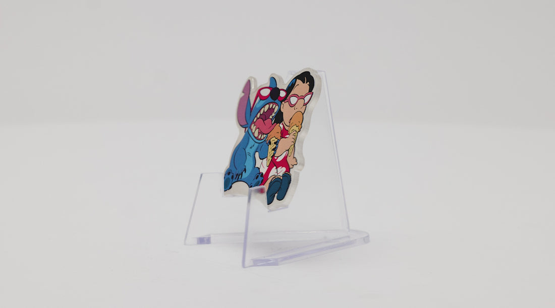 Lilo is calm and collected in her red dress and sunglasses, while Stitch digs in with his usual wild energy.
