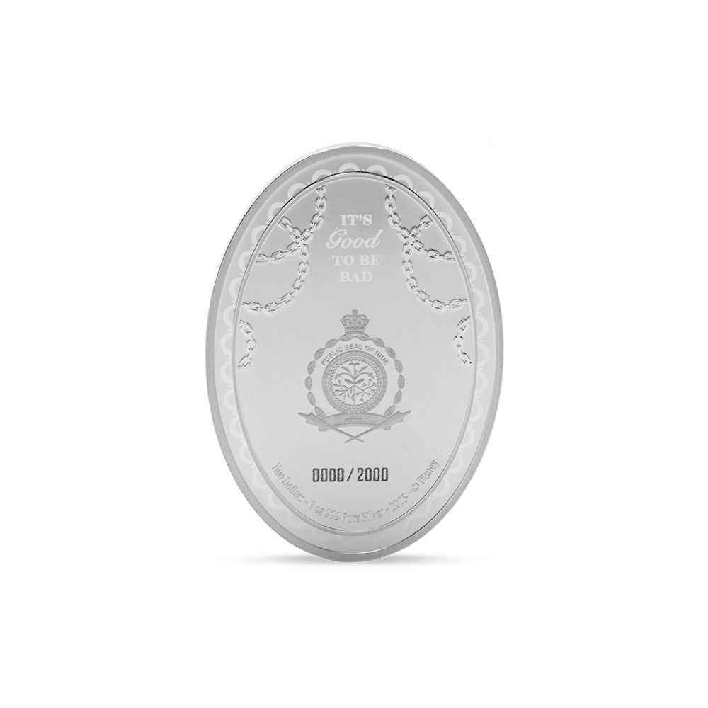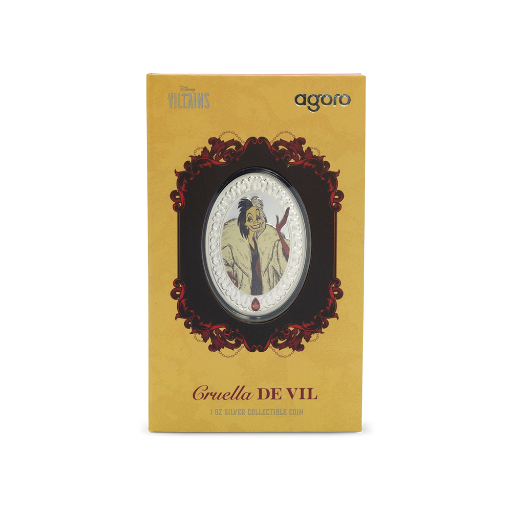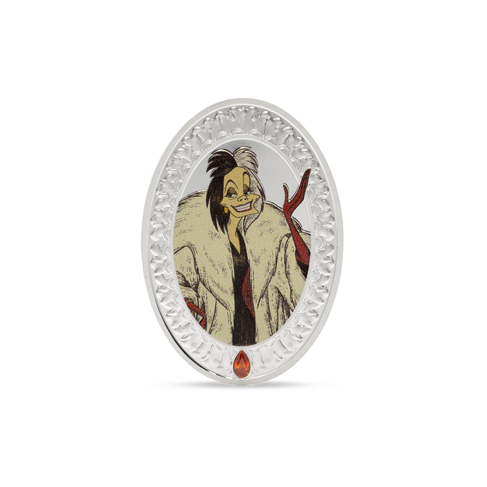 Disney’s most devilish fashionista, Cruella De Vil, is here, captured in 1oz of 999 pure silver. Her sharp features, striking black-and-white hair, and fiery red attire are brought to life in vivid color and proof detail.