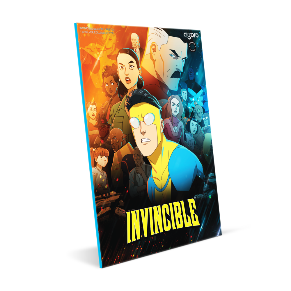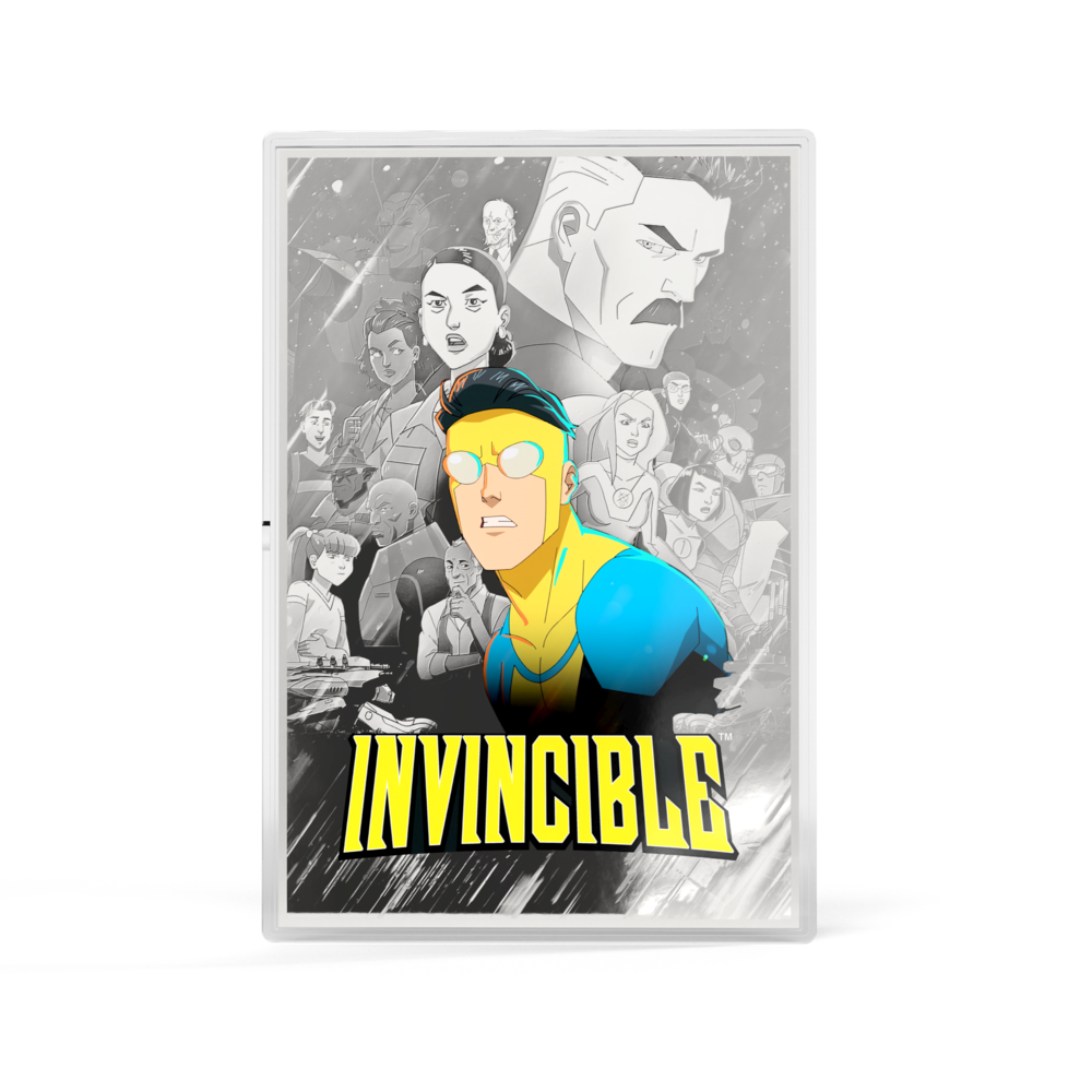 Season 1 of Invincible redefined what a superhero story could be. We’ve immortalized the groundbreaking season 1 poster, in a Legendary Mintage release of just 1000, on a 1oz 999 pure silver foil. At the forefront, Invincible stands in full color, ready for battle. Behind him, the supporting cast emerges in a finely engraved mirror finish.