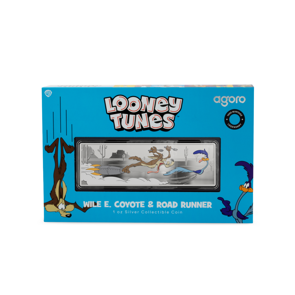 - A 1oz 999 pure silver collectible featuring the Wile E Coyote and Road Runner brought to life in stunning color and silver detailing.