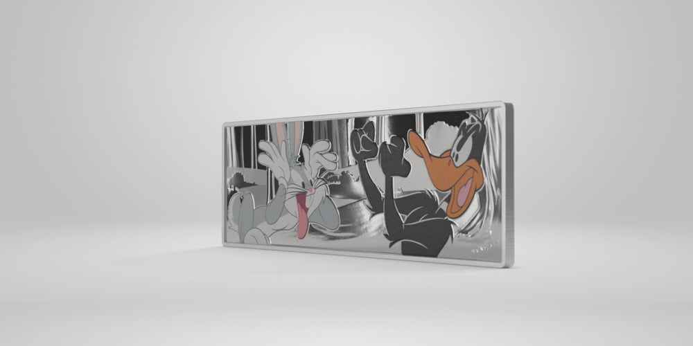 - A 1oz 999 pure silver collectible featuring Bugs Bunny and Daffy Duck.