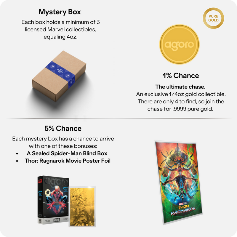 Are you ready to join the chase? This Marvel Mystery Box contains 4oz of legendary Marvel collectibles. Part of our Mystery Box Black Friday Gold chase!