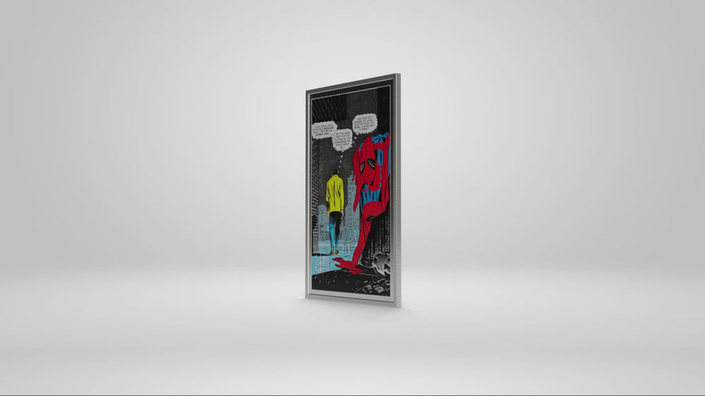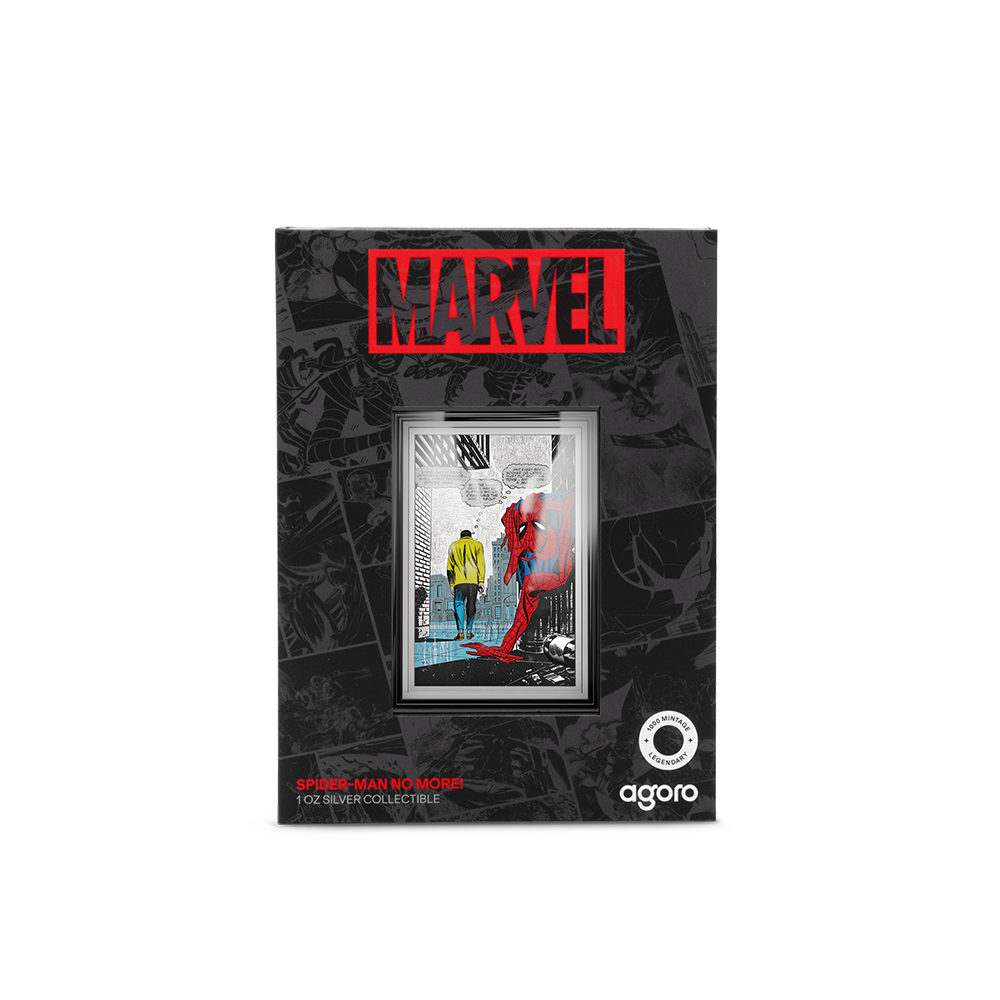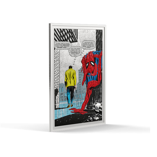 The full-page spread from Amazing Spider-Man #50 shocked readers, capturing Peter Parker as he walks away from the life of a superhero across rain-slicked streets. Now minted into history as the second release of our Iconic Moments series, this collectible is struck in 1oz of 999 pure silver, featuring the original dialogue and vintage coloring. A must-have for Marvel’s Spider-Man collectors.