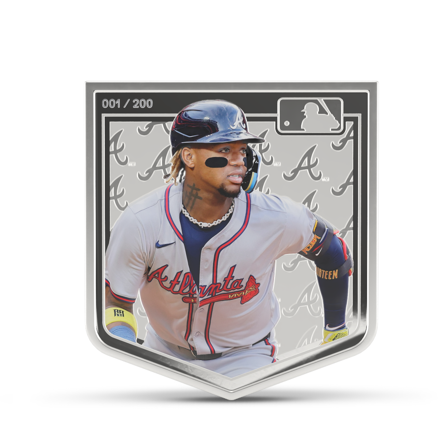- A graphic of the superstar in action stands out against the engraved background which sports the Atlanta Braves logo.