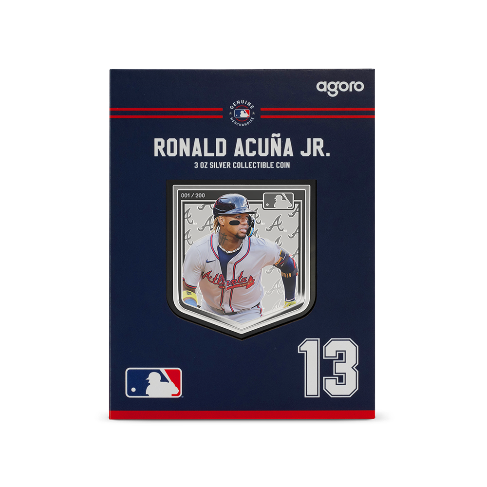 Celebrate Acuña Jr. with this 3oz collectible, shaped like home plate and struck from 999 pure silver. Limited to just 200 individually numbered pieces, it’s a bold tribute to one of the most dynamic stars in Baseball.