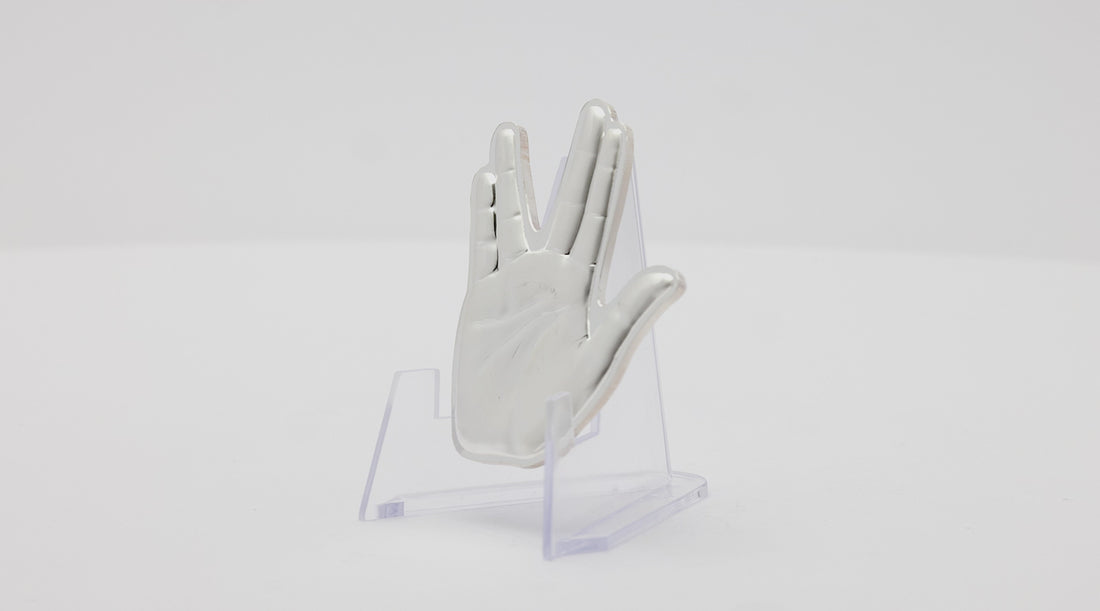 Now, both have been immortalized in 1oz of 999 pure silver. Struck in incredible high relief, the Vulcan Salute is captured in sculptural form. On the mirror-finish obverse, find Spock himself, engraved with the phrase: “Live long and prosper.”.
