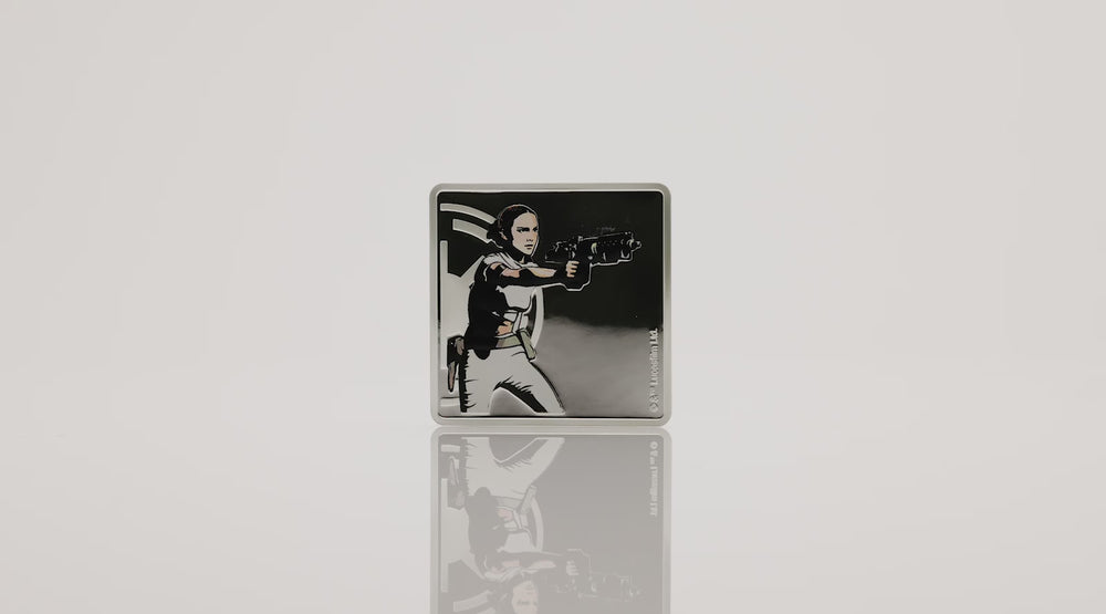 - Turn the collectible over to find Padmé Amidala holding a blaster pistol in front of the Republic crest.
