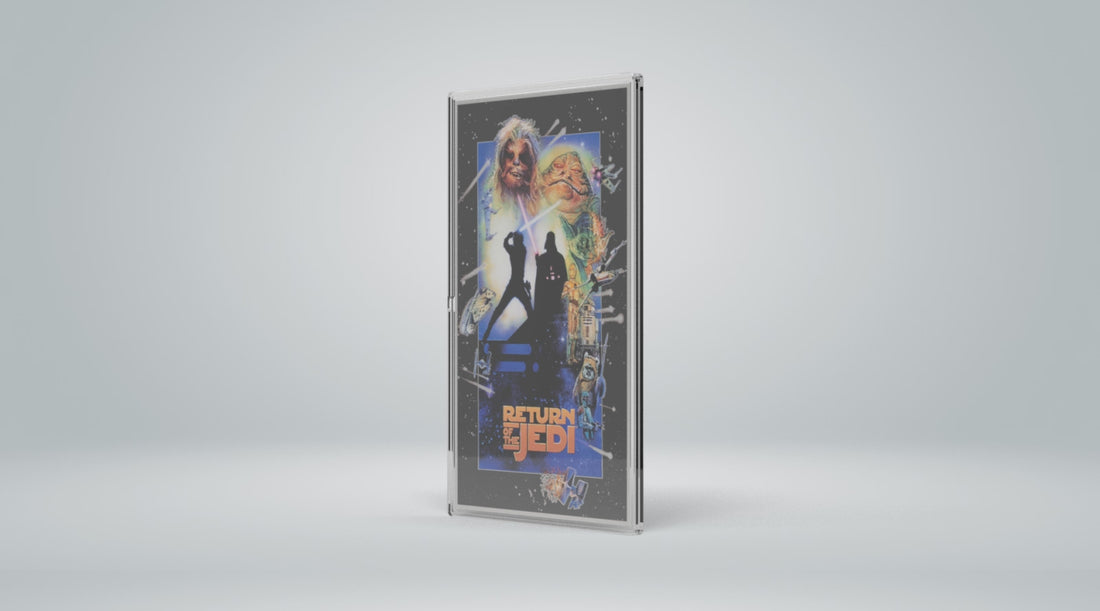 The third and final release in our STAR WARS™ Original Trilogy Poster series captures the legendary 1983 film in 1oz of 999 pure silver foil. A striking silhouette of Luke Skywalker™ and Darth Vader™ locked in a duel, accompanied by Leia™, Chewbacca™, R2-D2™, and more adorn the design. Struck on silver bursting with retro energy, and framed by a mirror-polished galaxy. A worthy finale of our original trilogy alternative art poster series.
