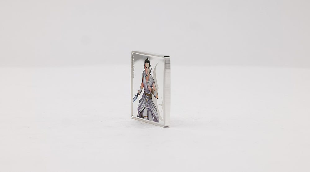 - The dual-sided design features Rey holding her Lightsaber in color. Engraved in relief and texture behind is the Jedi crest.