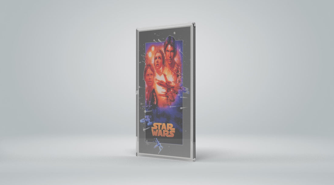 The first release in our Star Wars™ Original Trilogy Poster series captures the legendary 1977 film in 1oz of 999 pure silver foil. Later subtitled Star Wars: A New Hope™, this defining moment in cinema history is reimagined in striking detail. The alternate poster art bursts with retro energy, Han Solo, Princess Leia, and a young Luke Skywalker stand ready, while starships cut across the background in semi-transparent print. Framed against a mirror-polished galaxy with frosted stars, it’s a tribute worthy of the saga’s beginning.