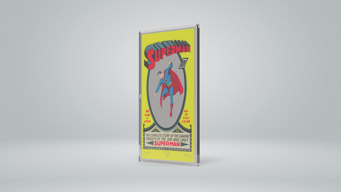 - A 1oz 999 pure silver collectible featuring the original cover of SUPERMAN #1 (Summer 1939) in its original colors