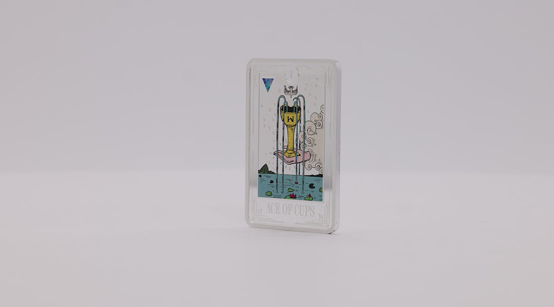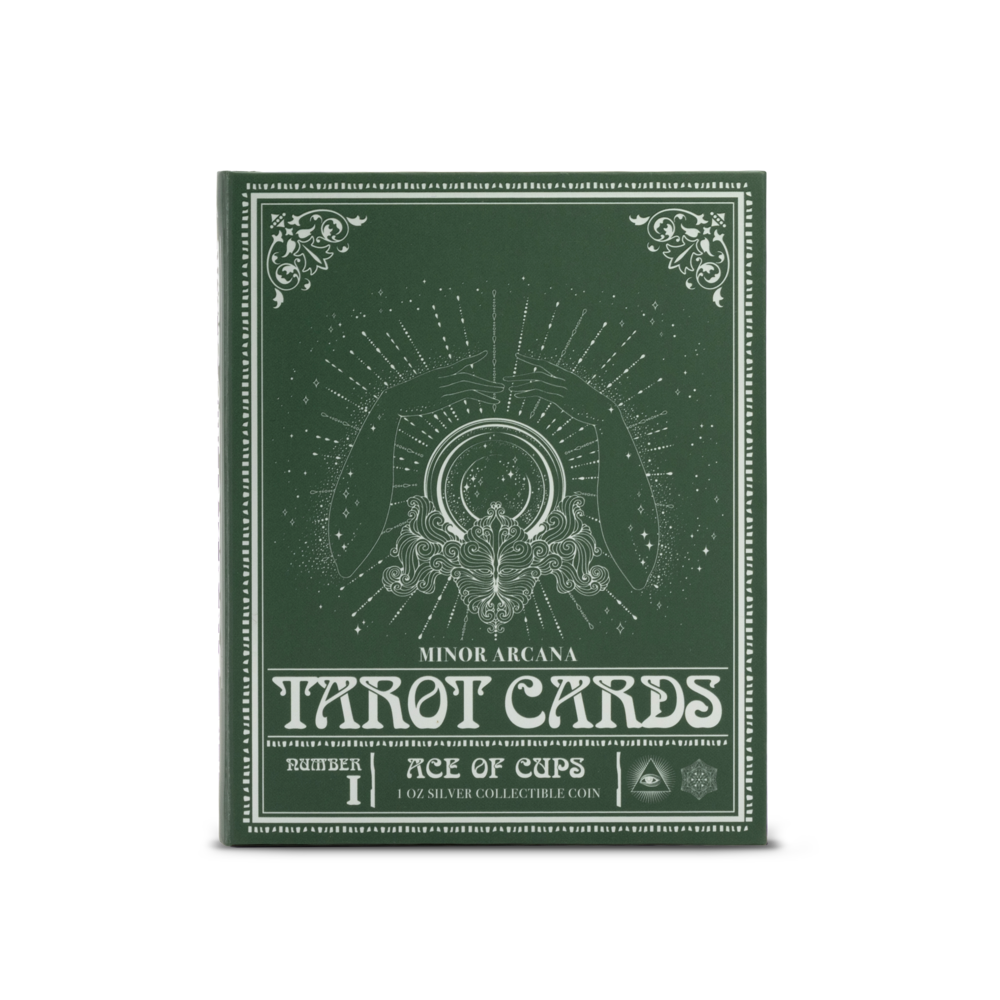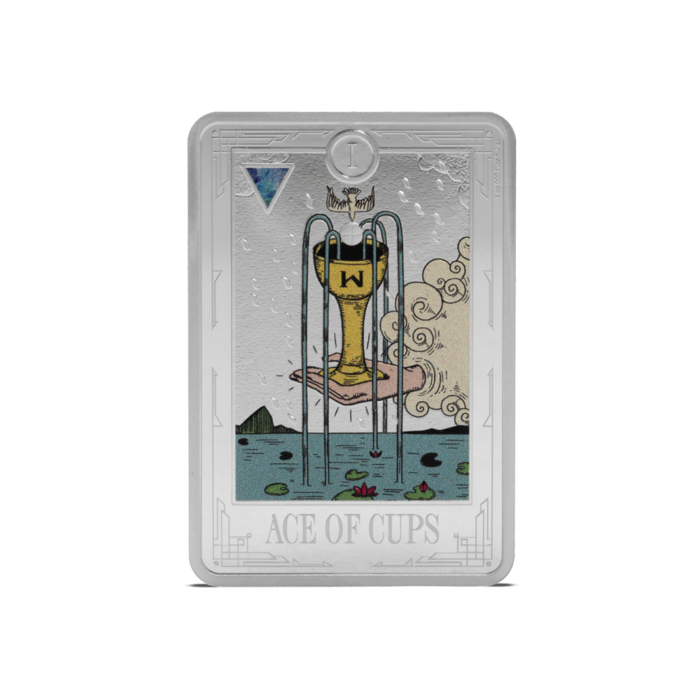 The Ace of Cups is the first release in our 1oz 999 pure silver Tarot Minor Arcana series. Stunning artwork, featuring an emerging hand from a soft silver-white cloud, in the centre, rests the Sacred Cup of Love, a golden chalice overflowing with five streams of life-giving water. The design is amplified with a framed mirror finish around the frosted artwork, and a stunning blue triangle set in the top left corner represents the alchemical symbol for water.