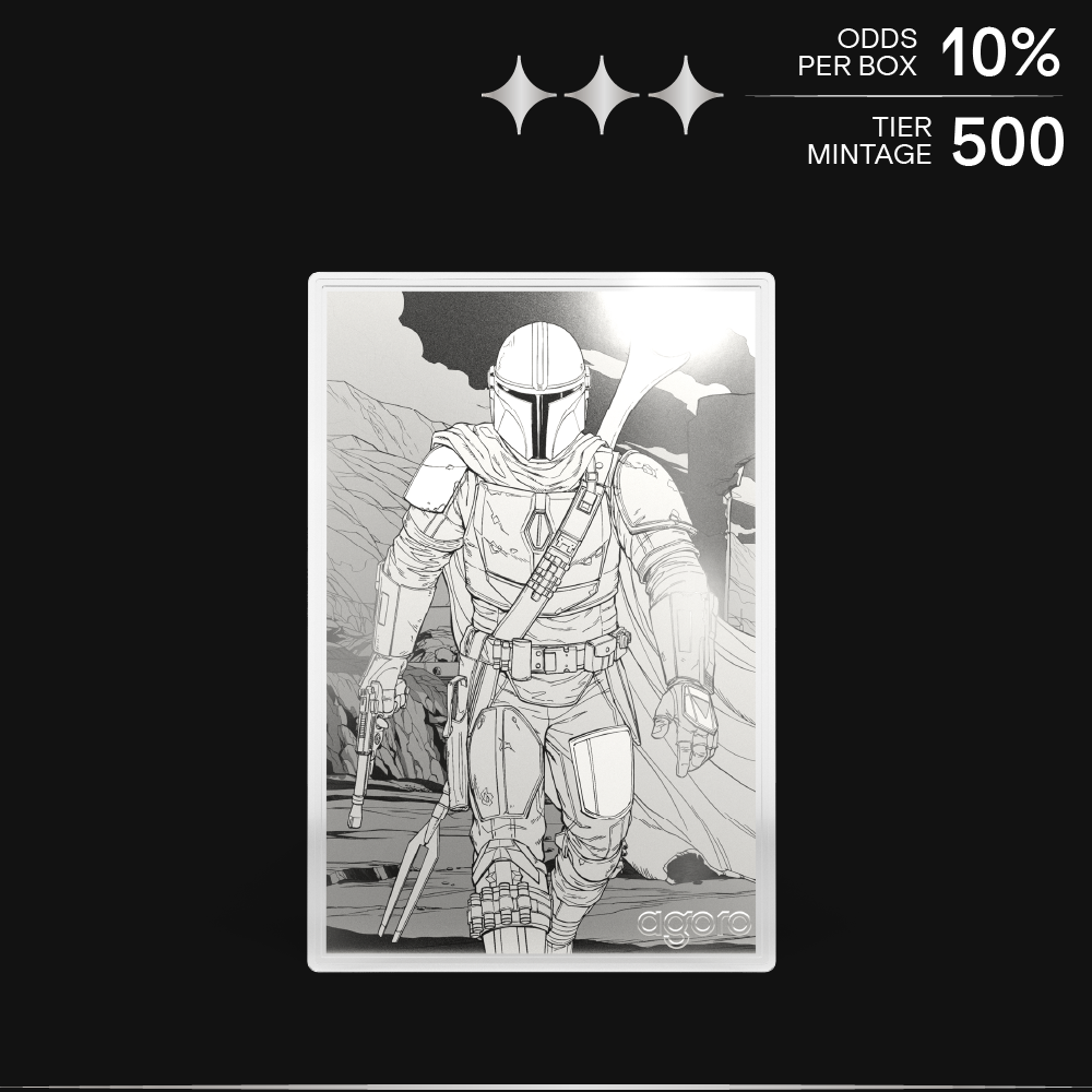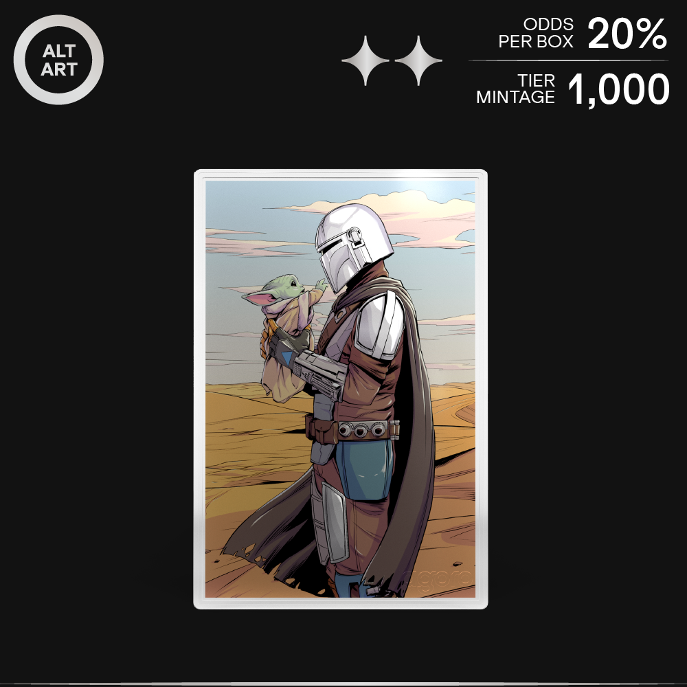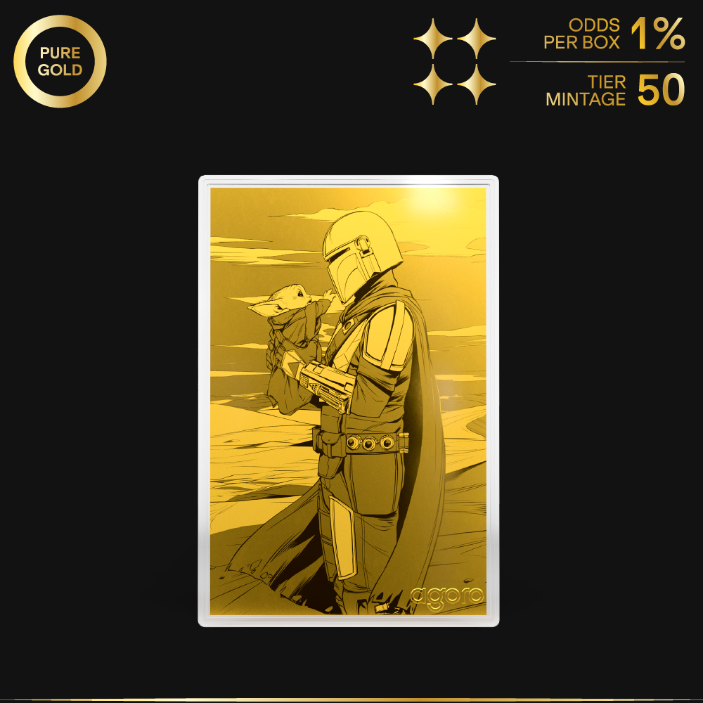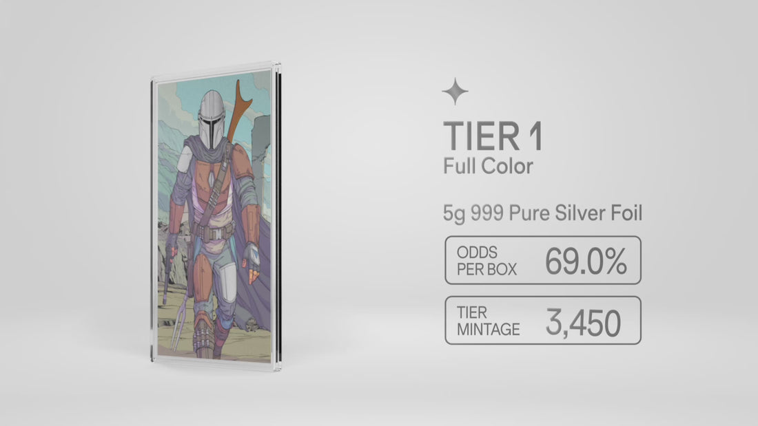 Follow the story of Din Djarin as he scours the galaxy for bounties and becomes Grogu's protector. Each box holds one of four limited-edition 5 g foils, crafted in pure silver or gold.