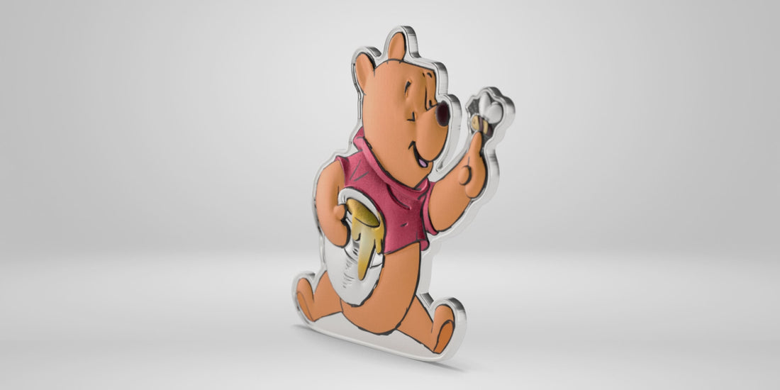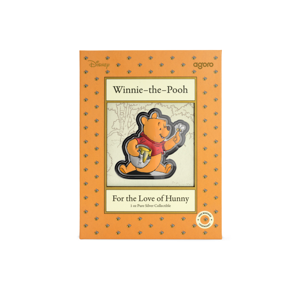 This officially licensed 1oz silver collectible is shaped and colored to bring Pooh to life in charming detail, complete with a bee perched on his finger and his beloved honey pot tucked under his arm. Can you spot the metallic color printing on his shirt and the honey pot? A true keepsake, crafted in 999 pure silver.