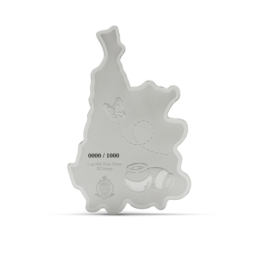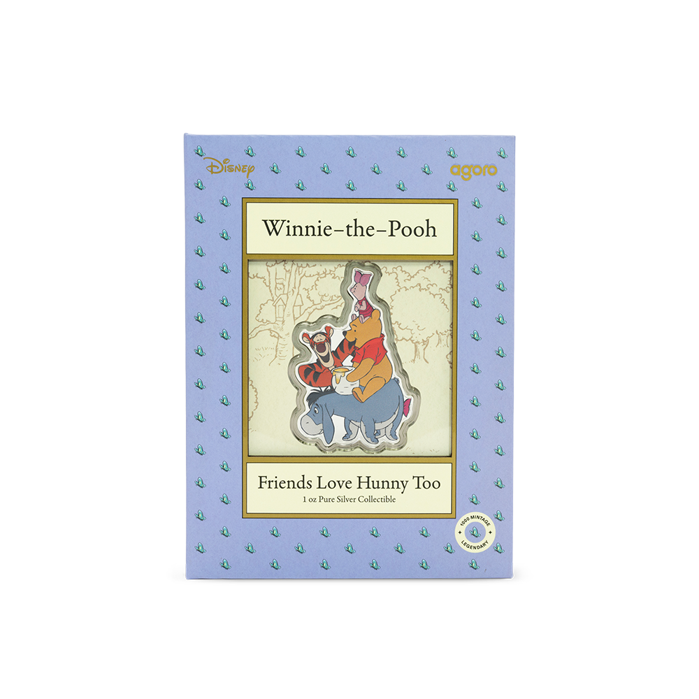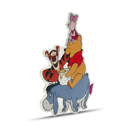 All of Disney’s Winnie the Pooh lovable charm is captured in 1oz of 999 pure silver. This shaped and colored collectible brings Winnie the Pooh and friends riding happily atop Eeyore, with Piglet perched on Pooh’s shoulders as they journey through the Hundred Acre Wood. As the second release in our series celebrating 100 years of Winnie the Pooh, it’s a heartwarming tribute, because honey is always better with friends.